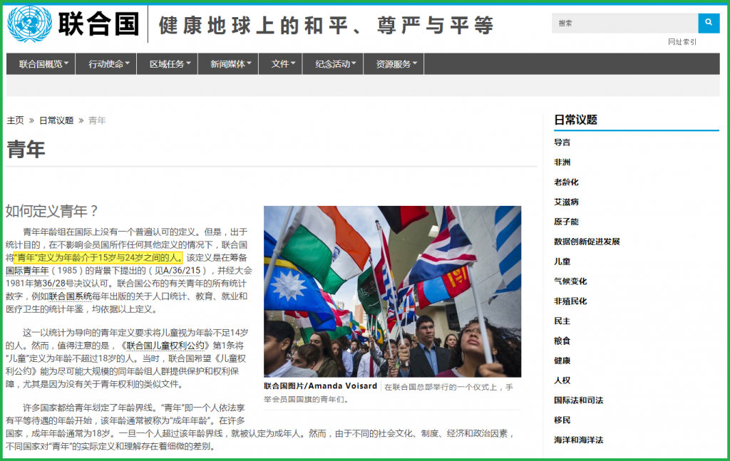 請戳 聯合國官方頁面中文版 ,黃色標記的文字,就是人家聯合國,白紙黑字清楚什麼是青年人: 聯合國將“青年”定義為年齡介於 15 歲與 24 歲之間的人。